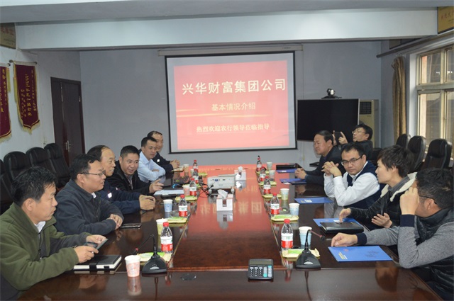 在会议室,公司领导首先对多年来农业银行对企业发展提供的支持和帮助表示衷心感谢。之后财务部部长汤水旺围绕兴华财富集团旗下的钢铁主业的发展历程、企业的资质和荣誉、企业生产设备规模、H型钢产品在全国市场的优势;非钢产业,五星级酒店—武安财富国际酒店、澳大利亚铁矿、吉尔吉斯斯坦金矿、钻石城地产、廊坊永清地产、永清兴华现代农业产业园等多元产业项目,向银行领导做全面扼要的介绍。
